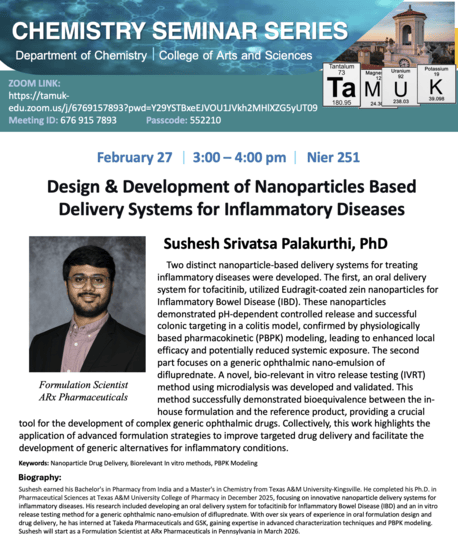 Friday, February 27, 2026, 3-4 pm, Nier 251 "Design & Development of Nanoparticles Based Delivery Systems for Inflammatory Diseases" - Dr. Sushesh Srivatsa Palakurthi