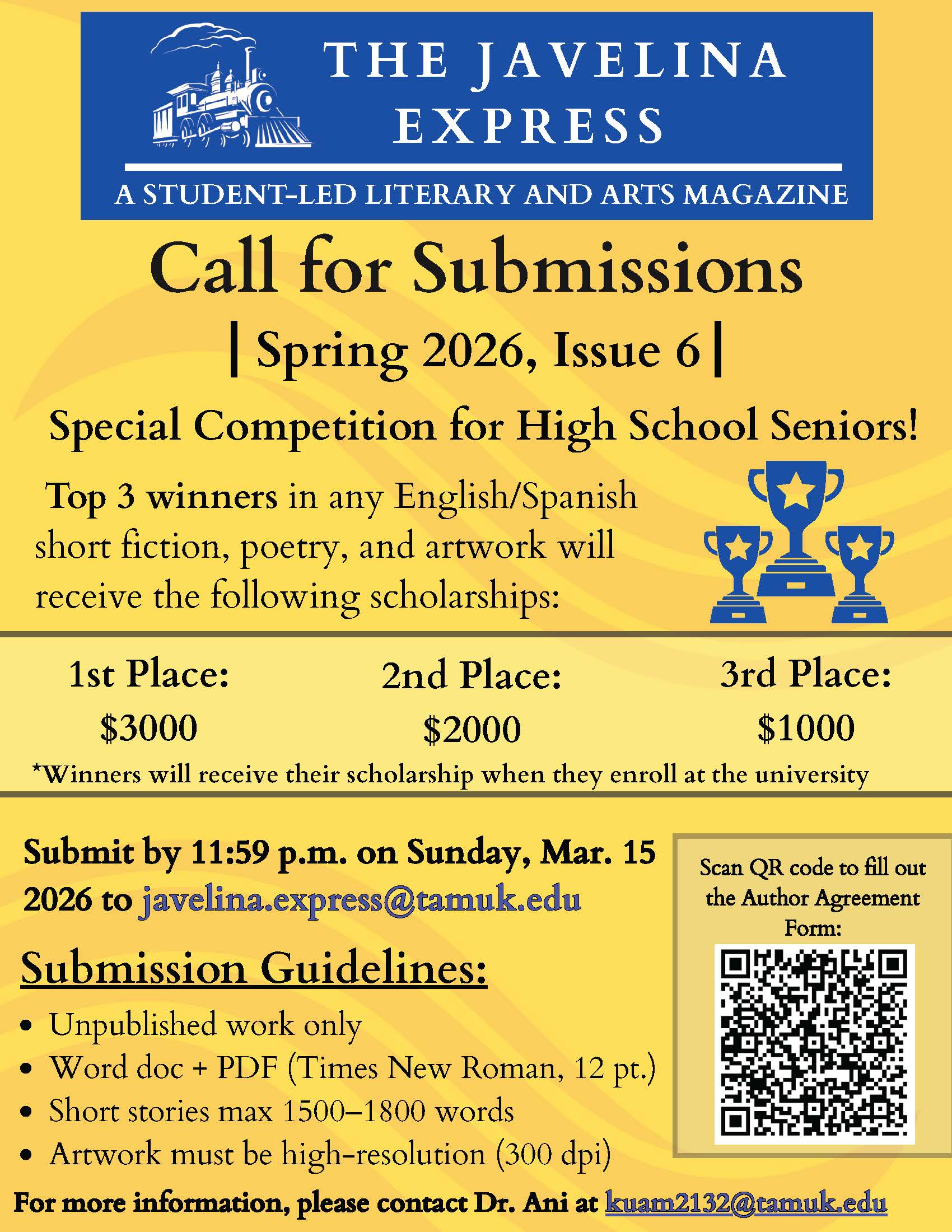 The Javelina Express is accepting submissions for our Spring 2026 issue. Issue 6 has an open theme--submissions on all topics are welcome! If you have stories, poems, essays, or artwork, please email them to us at javelina.express@tamuk.edu. Also, please follow the link below and fill out the Author Agreement form: https://forms.office.com/r/nPtJmxvrvz We accept submissions in English and Spanish. Please submit your work by 11:59 p.m. on Sunday, Mar. 15, 2026. Make sure to check out the Submission Guidelines. General submissions are accepted from the entire university community: all students, faculty, staff, and alumni. We look forward to reviewing your submissions. |
