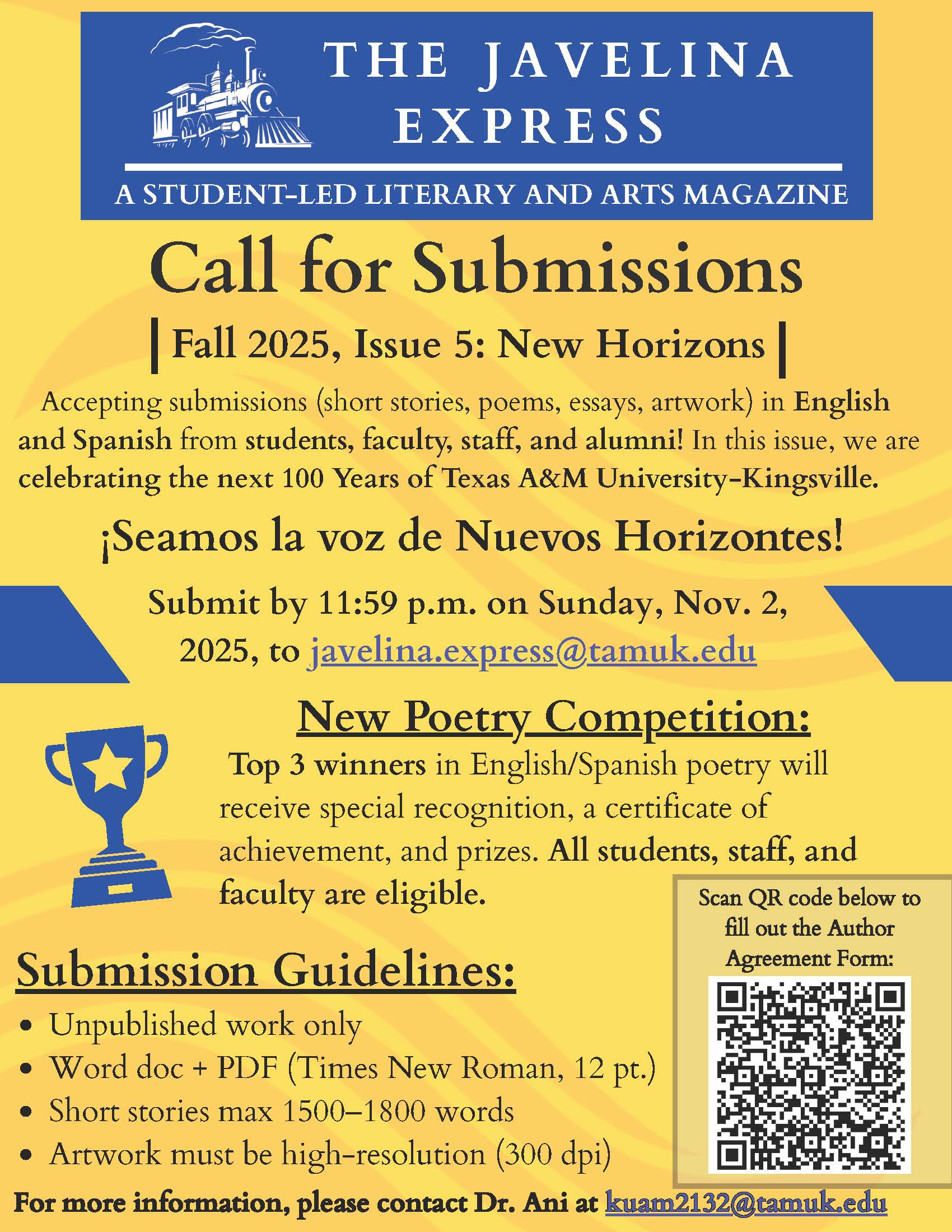 The Javelina Express is accepting submissions for our Fall 2025 issue. The theme for Issue 5 is New Horizons, celebrating the next 100 years of Texas A&M University-Kingsville! Javelinas are a community of explorers, trailblazers, and harbingers of change. ¡Seamos la voz de Nuevos Horizontes! If you have stories, poems, essays, or artwork, please email them to us at javelina.express@tamuk.edu. Also, please follow the link below and fill out the Author Agreement form: https://forms.office.com/r/nPtJmxvrvz We accept submissions in English and Spanish. Please submit your work by 11:59 p.m. on Sunday, Nov. 2, 2025. |