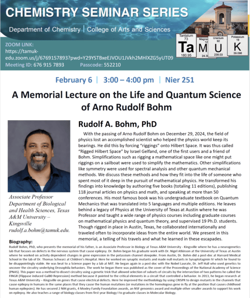 Friday, February 6, 2026, 3-4 pm, Nier 251 "A Memorial Lecture on the Life and Quantum Science of Arno Rudolf Bohm" - Dr. Rudolf A. Bohm