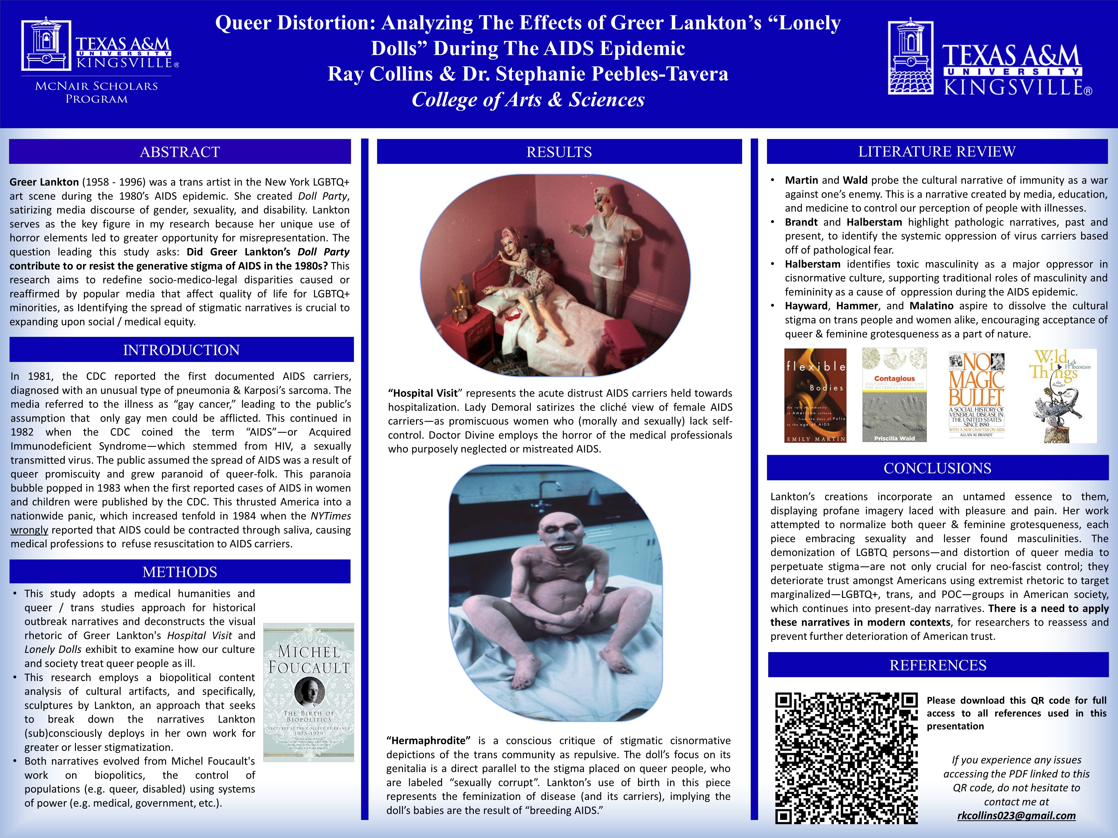 In this research project, I analyze artist Greer Lankton’s exhibit Doll Party, an installation of various dolls created throughout the AIDS epidemic that offer satirized grotesque visages of trans and queer women as inherently effeminate or feminized by their proximity to AIDS. Using a queer studies and medical humanities approach that deploys Jack Halberstam’s concept of female masculinity and Priscilla Wald’s examination of outbreak narratives, I highlight how Lankton’s work problematizes cultural narratives of binary gender that feminize AIDS and its predominately gay male victims, leading to the medical industry’s stigmatization and neglect of queer-folk and AIDS carriers during 1980s America. This hostile relationship between (presumably cis) practitioners and queer patients continues into the twenty-first century. I firmly argue that Lankton’s over-usage of horror elements and grotesqueness in her work satirizes this hostile relationship and the media narratives that pathologize queer victims of AIDS to create a cognitive dissonance—which I call queer dissonance—between her audience and the media narratives themselves, with the goal of correcting this hostile relationship. I suggest that in over-satirizing the misrepresentation of queer-folk during the AIDS epidemic, Lankton’s work fails to appeal to twenty-first century audiences and ironically contributes to the stigmatic narratives of queer-folk that she aimed to prevent.